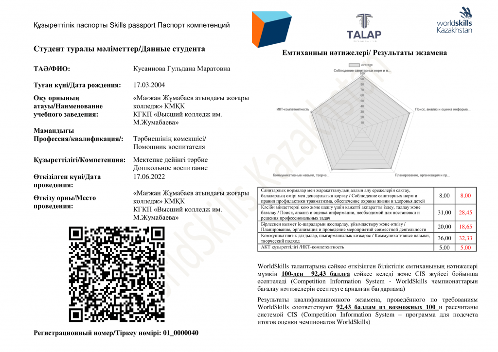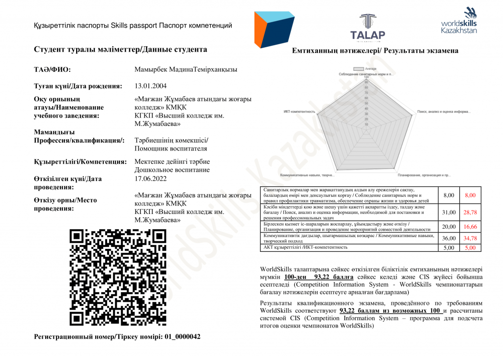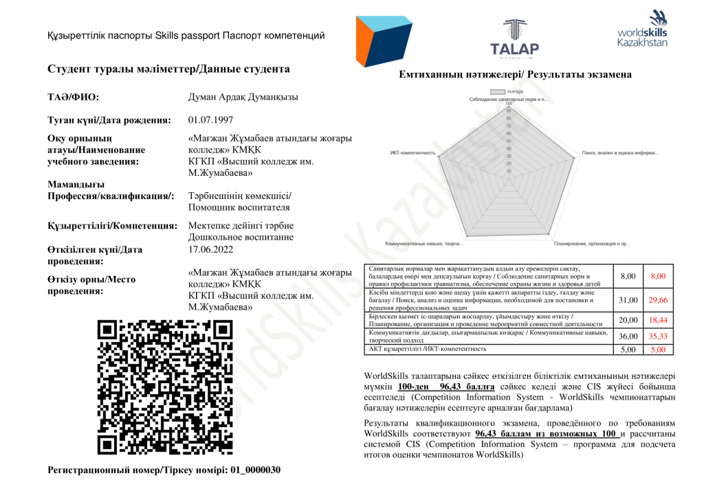 Мамандық: 01120100 – Дошкольное воспитание и обучение. Біліктілік: 3W01120101 (код в МСКО 0112, код в НКЗ РК 5311-2) - Помощник воспитателя