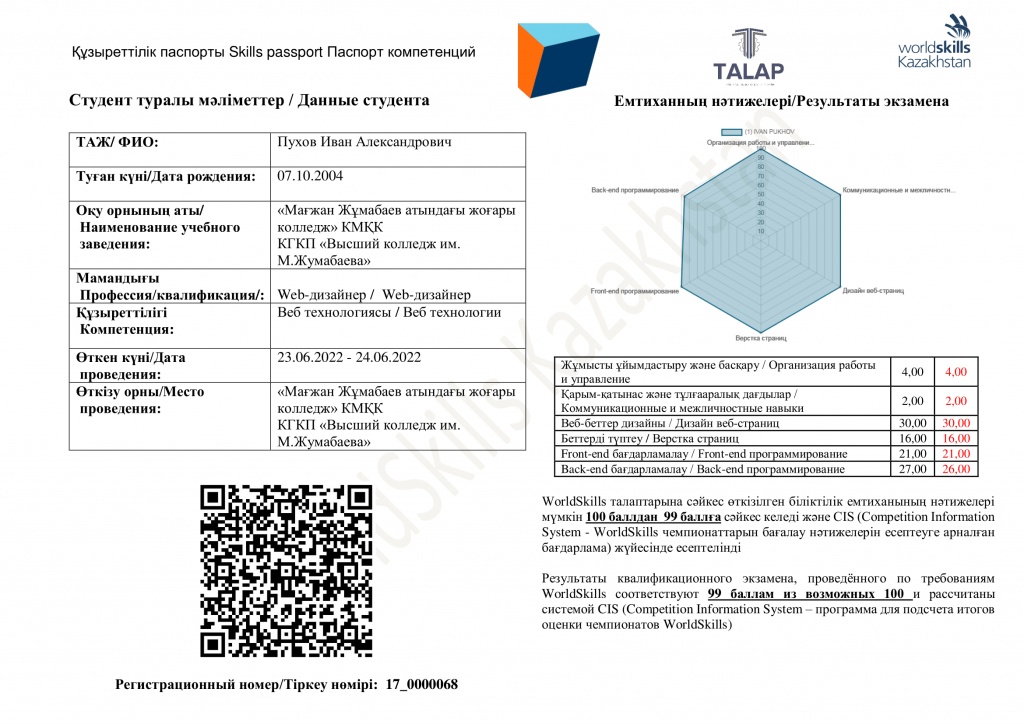 Мамандық: 06130100 Программное обеспечение (по видам). Біліктілік: 3W06130102 (код в МСКО 0613, код в НКЗ РК 3122-2) Web-дизайнер